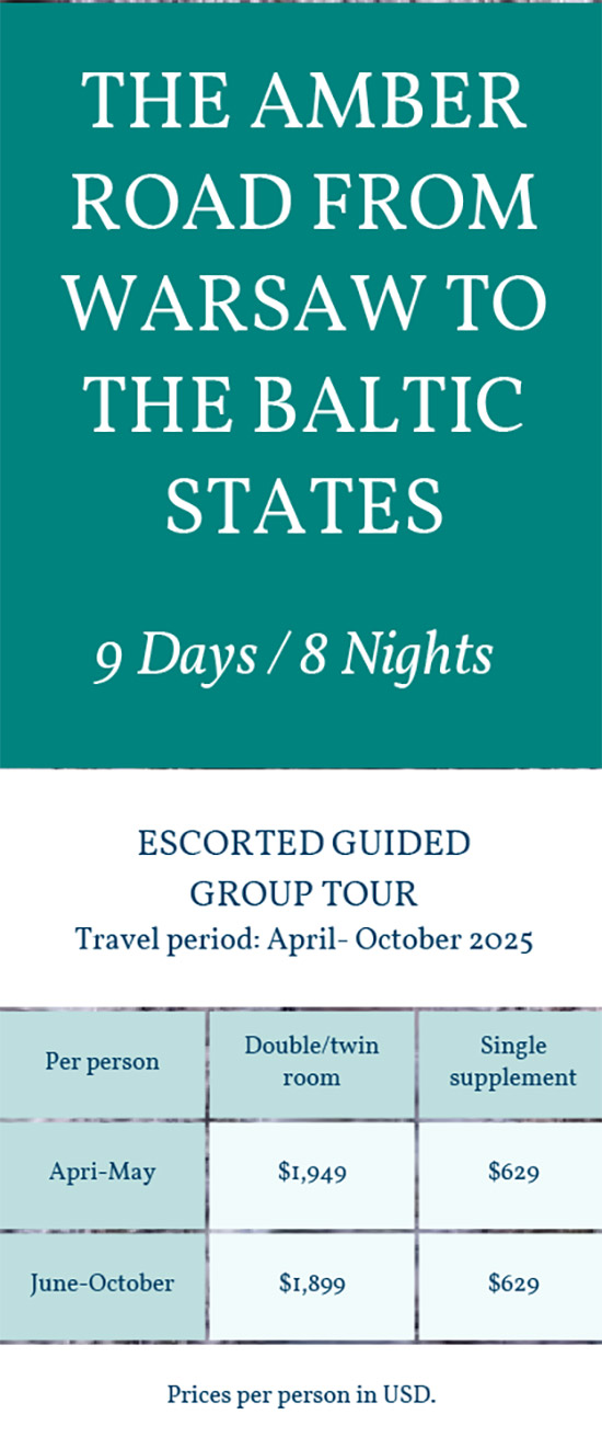 This escorted Guided Tour takes you to Poland, Lithuania, Latvia and Estonia.