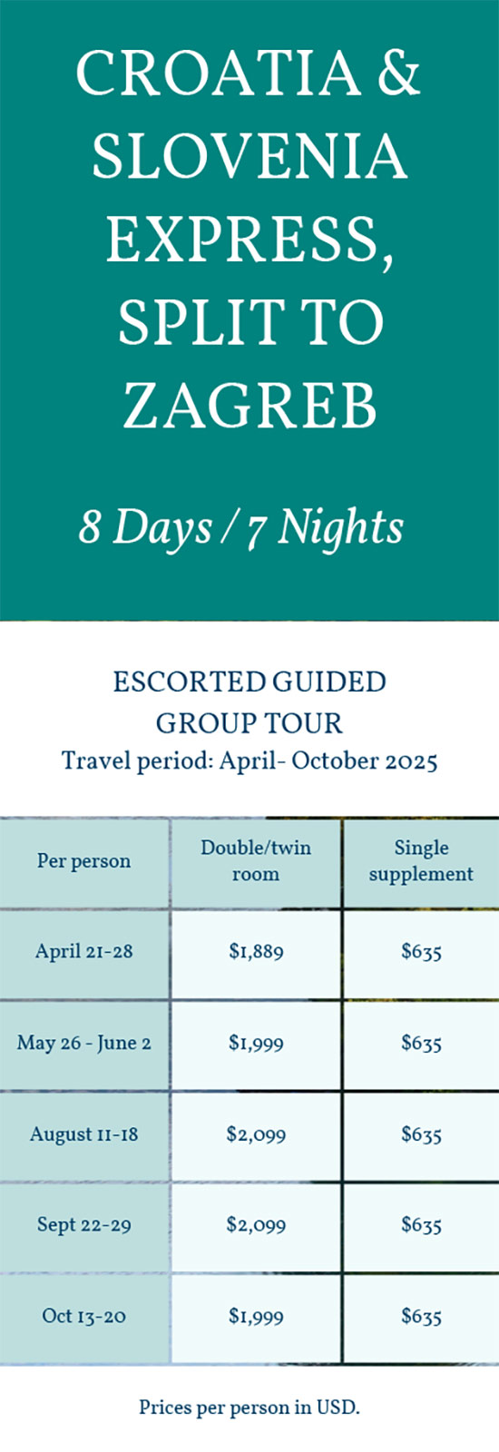 8 Days escorted guided tourfrom Split to Zabreb through Trogir, Opatija, Bled, Ljubljana