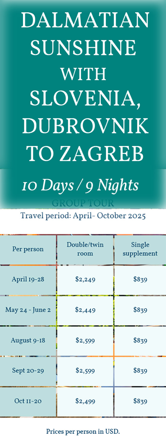 This is a 10 Days journey along the beautiful Dalmatian coastline in Croatia. You will see: Dubrovnik - Split - Plitvice Lakes - Bled - Zagreb and much more...