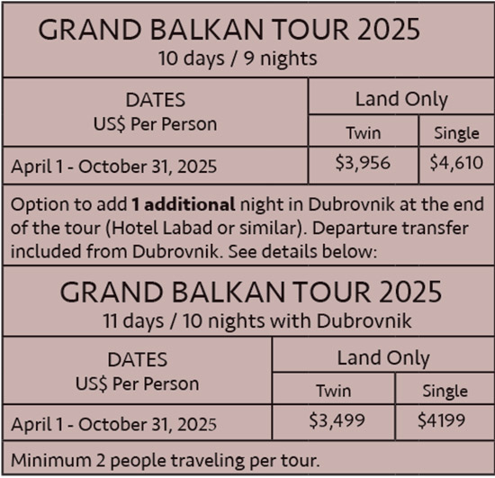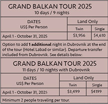 Grand Balkan Tour to enchanting cities between April 1 - November 31. Explore Tirana, Kruja, Apolonia, Pogradec, Lake Ohrid, Drillon National Park, Skopje, Prizren in Kosovo and Podgorica - the capital of Montenegro.