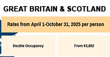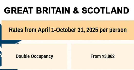 8 days / 7 nights Independent Tour experiencing two great British cities.You will be travelling from London to Edinburgh and ending in London! Enjoy wonderful accommodations, daily breakfasts, choice of walking tours, open air bus tours and more. The tour is available in both 3* and 4* hotels.