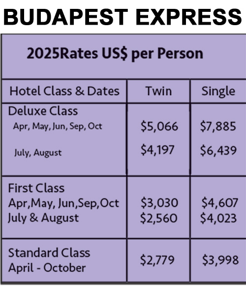 12 days / 11 nights independent tour from Prague to Vienna, Salzburg and Budapest Hungary. First Class Rail and 3 nights accommodation are included. There are scheduled sightseeing in each city. Tour is available in 3 Hotel categories: Deluxe, First Class and Standard Class.